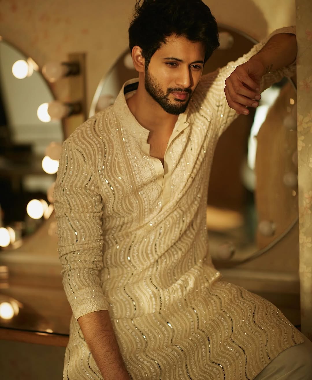 Make a sophisticated statement with this stunning Ivory Kurta Pajama Set. This ensemble is specially designed for wedding ceremonies like Haldi, Sangeet, or any grand festive occasion.